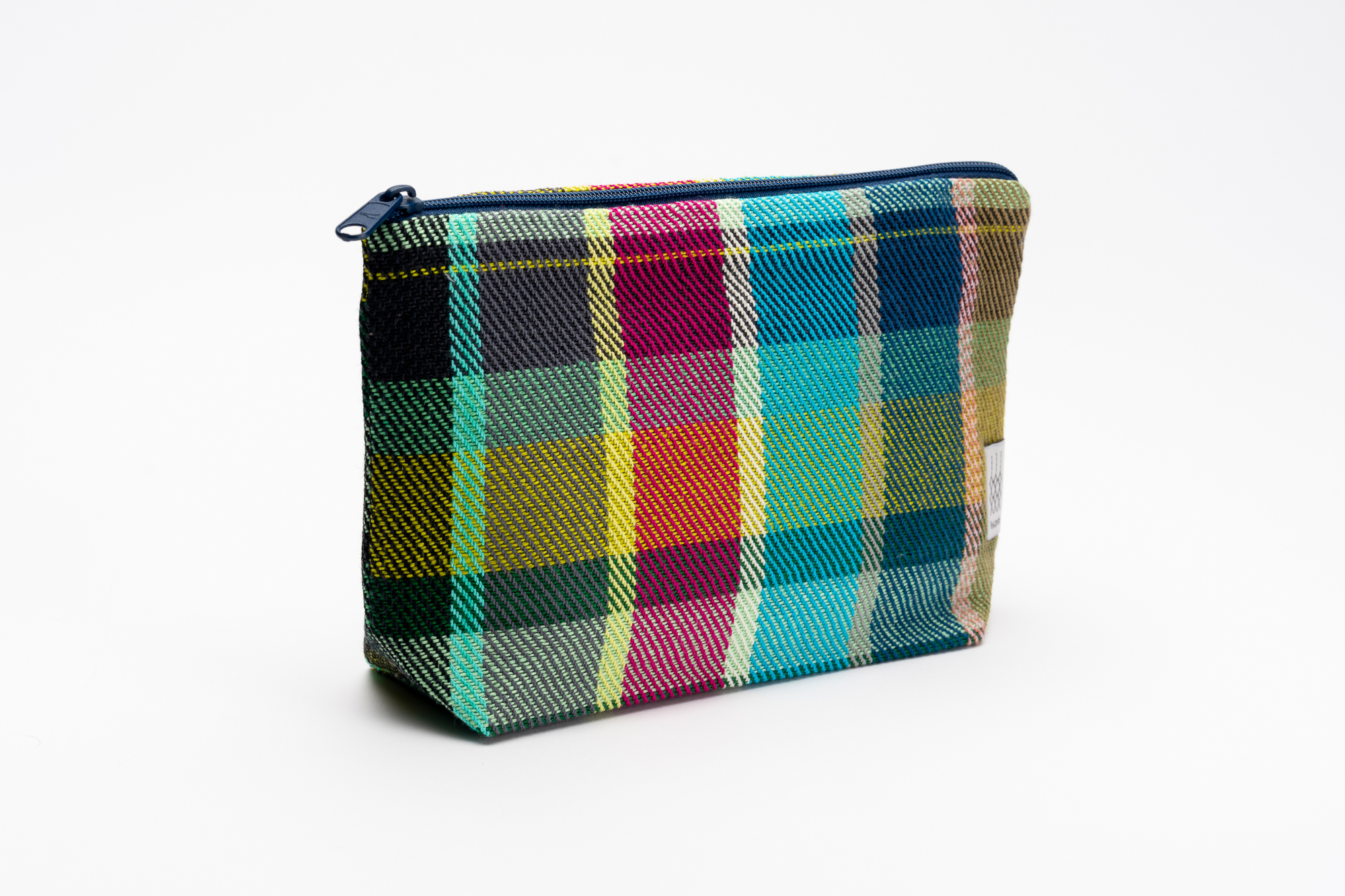 Der Stoff ist aus festem Halbleinen, so dass die Form stabil bleibt und den Inhalt gut schützt. Das Webmuster ist eine Köperbindung, gut ersichtlich an den diagonalem Webstreifen. In der Kette werden zahlreiche Farben aufgezogen, das Schussgarn wird alle paar Zentimeter gewechselt, so dass ein unregelmässiges, fröhlich-farbenreiches Karomuster entsteht.