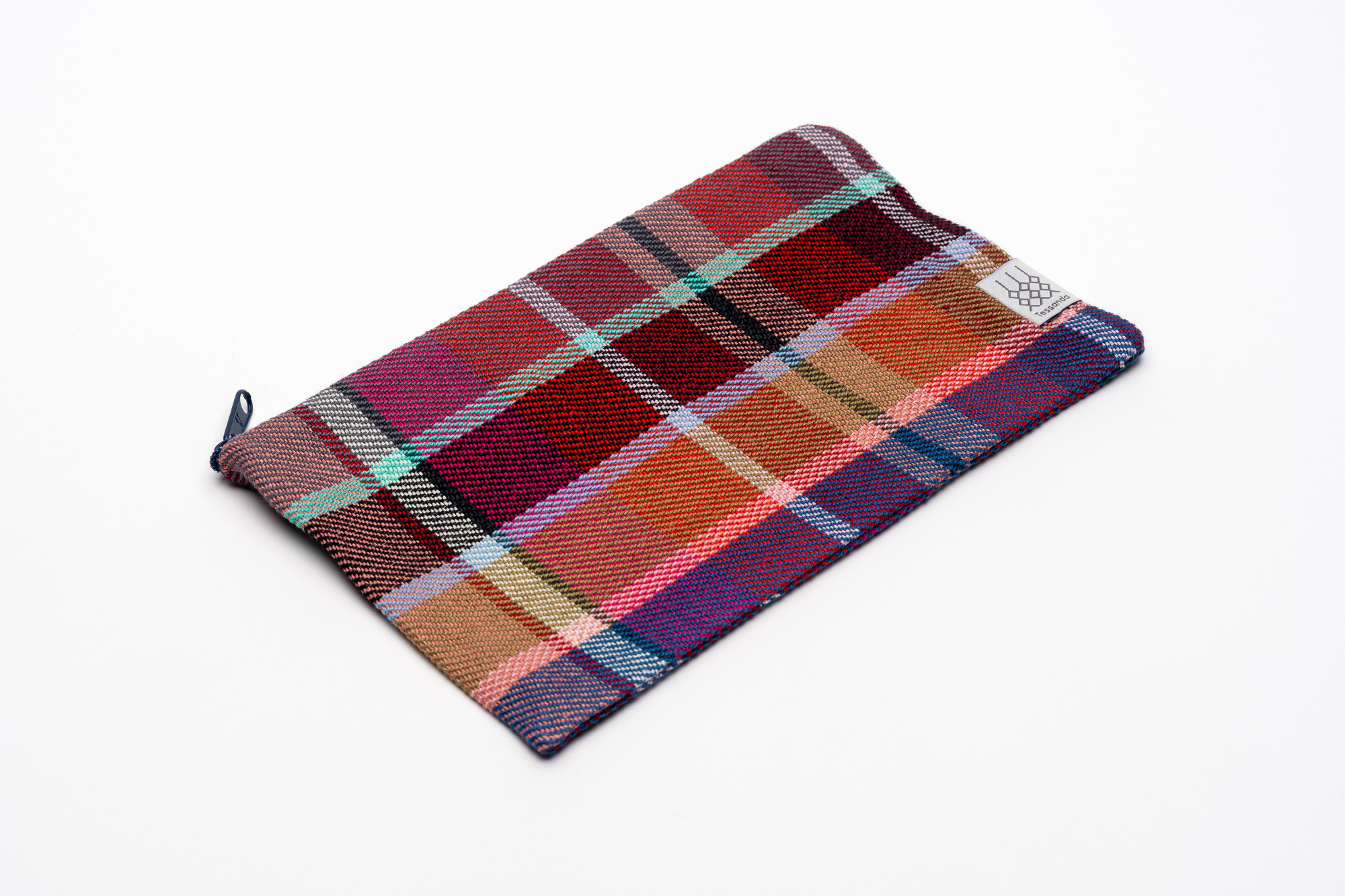 Der handgewobene Stoff ist aus festem Halbleinen, so dass die Form stabil bleibt und den Inhalt gut schützt. Das Webmuster ist eine Köperbindung, gut ersichtlich an den diagonalem Webstreifen. In der Kette werden zahlreiche Farben aufgezogen, das Schussgarn wird alle paar Zentimeter gewechselt, so dass ein unregelmässiges, fröhlich-farbenreiches Karomuster entsteht.