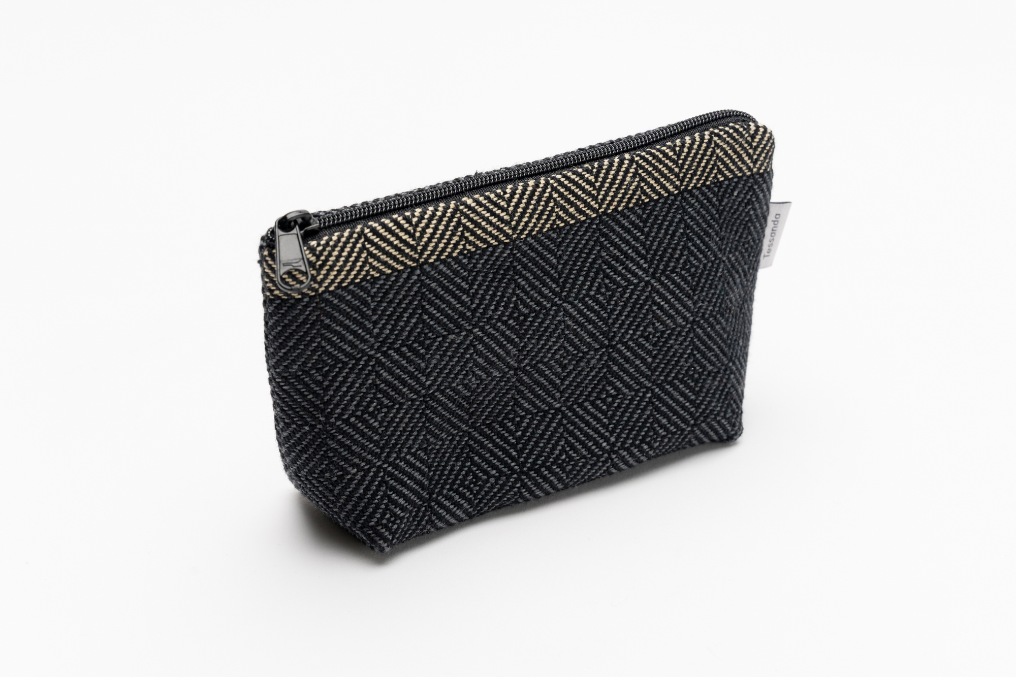 Der Einzug im Fischgratköper bildet mit der unterschiedlichen Tretweise einen sogenannten Diamantköper. Vier Quadrate bilden zusammen das Design, wobei die Diagonalen der Quadrate bewusst versetzt sind. In die schwarzen Kettfäden wird der Schussfaden in unterschiedlichen Farben gewoben. Auf einer Seite des Etuis ist am oberen Rand der Abschluss farblich mit einem Streifen abgesetzt.