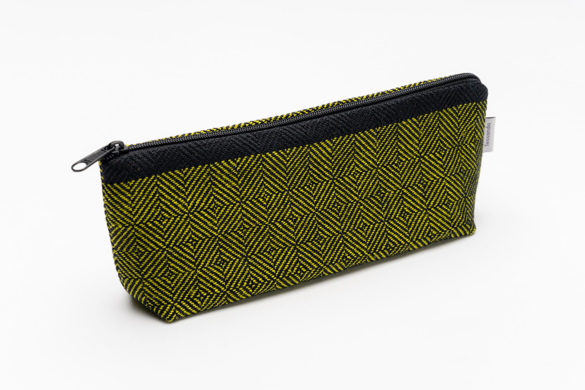 Der Einzug im Fischgratköper bildet mit der unterschiedlichen Tretweise einen sogenannten Diamantköper. Vier Quadrate bilden zusammen das Design, wobei die Diagonalen der Quadrate bewusst versetzt sind. In die schwarzen Kettfäden wird der Schussfaden in unterschiedlichen Farben gewoben. Auf einer Seite des Etuis ist am oberen Rand der Abschluss farblich mit einem Streifen abgesetzt.