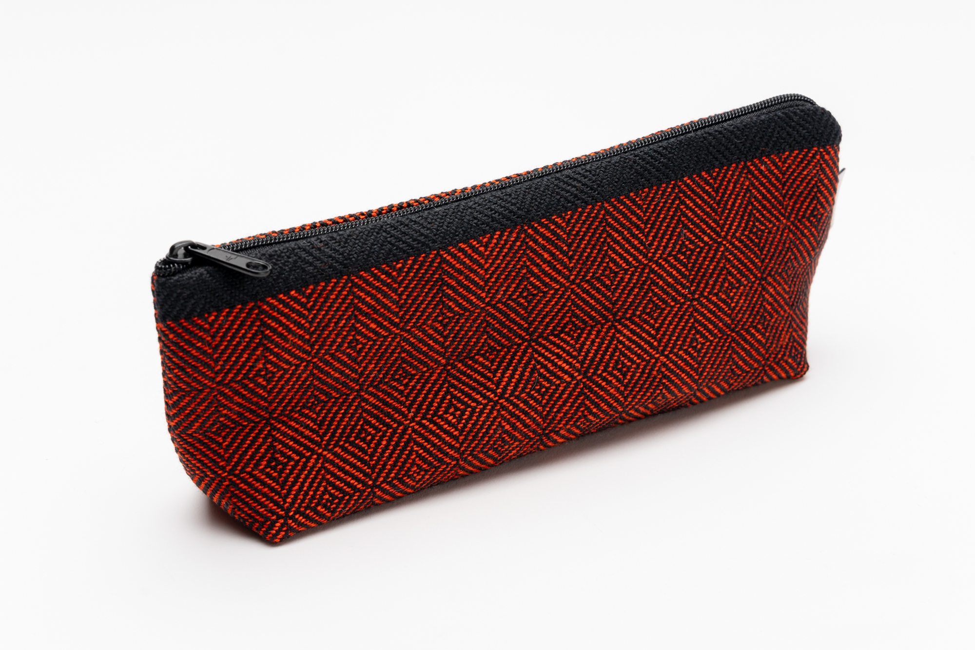 Der Einzug im Fischgratköper bildet mit der unterschiedlichen Tretweise einen sogenannten Diamantköper. Vier Quadrate bilden zusammen das Design, wobei die Diagonalen der Quadrate bewusst versetzt sind. In die schwarzen Kettfäden wird der Schussfaden in unterschiedlichen Farben gewoben. Auf einer Seite des Etuis ist am oberen Rand der Abschluss farblich mit einem Streifen abgesetzt.