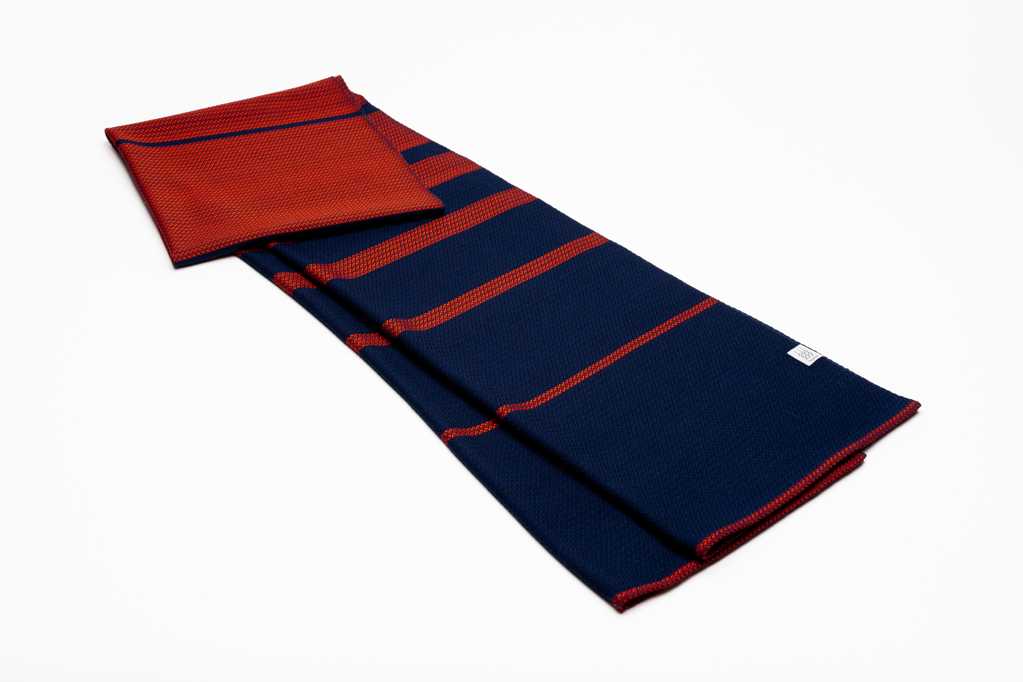 Das Streifendesign hat Gauthier Cerf exakt auf die Fibonacci-Zahlenreihe abgestimmt. Die Streifen sind 1, 2, 3, 5, 8, 13 und 21 cm lang und kommen gleich vier-fach vor. Nämlich: Beginnend vom Saum im breitesten Streifen in Dunkelblau und bis zur Mitte des Schals sich verschmälernd. Und gegengleich von der Mitte startend im breitesten Streifen in einer der vier Farben und schmäler werdend bis hin zum Saum. Der Schal ist mittig spiegelsymmetrisch, so finden wir die gleichen Streifen auf der anderen Schalhälfte. Es entsteht eine ästhetische Harmonie und eine verborgene Ordnung, die eine faszinierende Leichtigkeit und Klarheit ausdrückt.