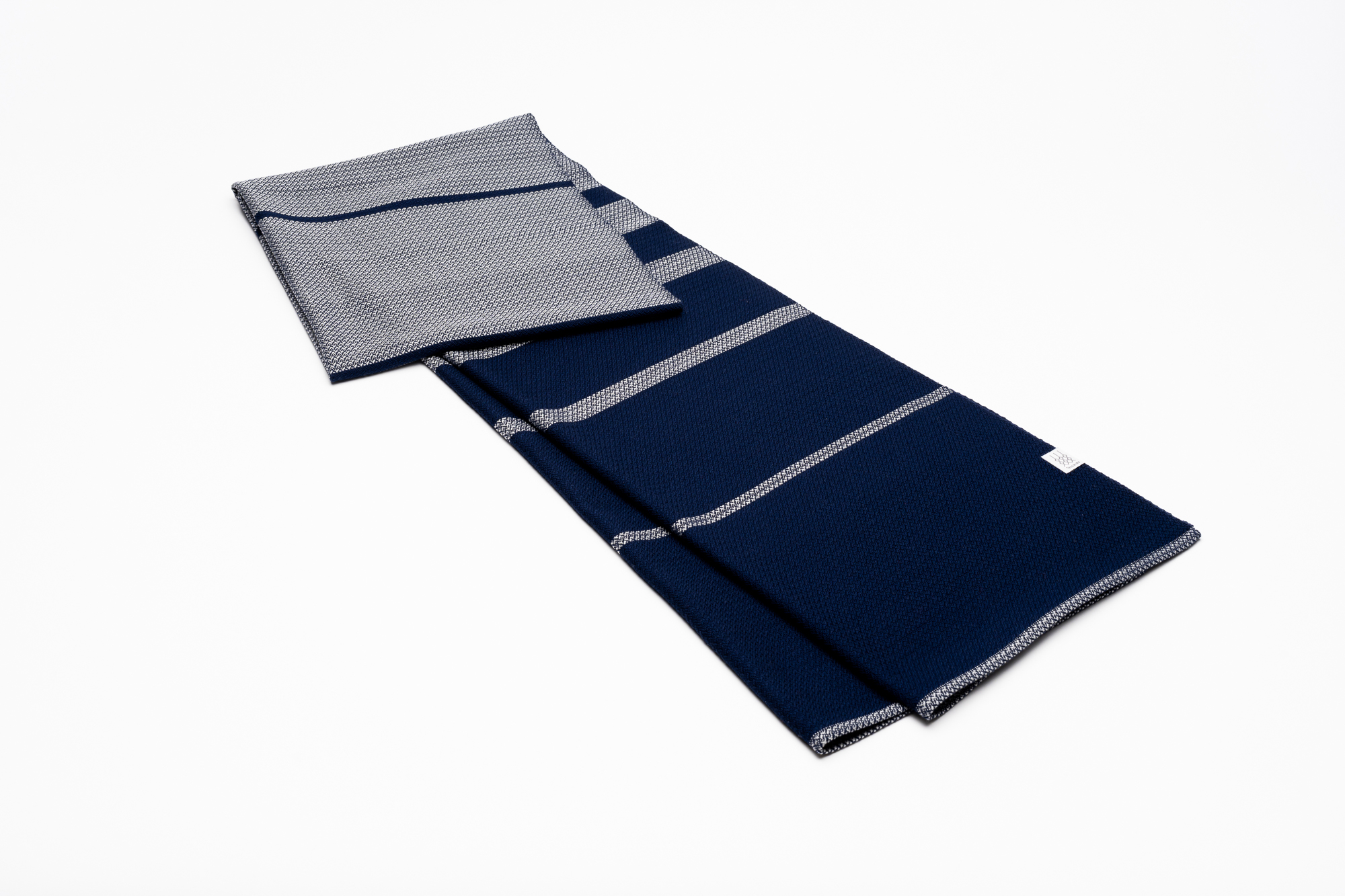 Das Streifendesign hat Gauthier Cerf exakt auf die Fibonacci-Zahlenreihe abgestimmt. Die Streifen sind 1, 2, 3, 5, 8, 13 und 21 cm lang und kommen gleich vier-fach vor. Nämlich: Beginnend vom Saum im breitesten Streifen in Dunkelblau und bis zur Mitte des Schals sich verschmälernd. Und gegengleich von der Mitte startend im breitesten Streifen in einer der vier Farben und schmäler werdend bis hin zum Saum. Der Schal ist mittig spiegelsymmetrisch, so finden wir die gleichen Streifen auf der anderen Schalhälfte. Es entsteht eine ästhetische Harmonie und eine verborgene Ordnung, die eine faszinierende Leichtigkeit und Klarheit ausdrückt.