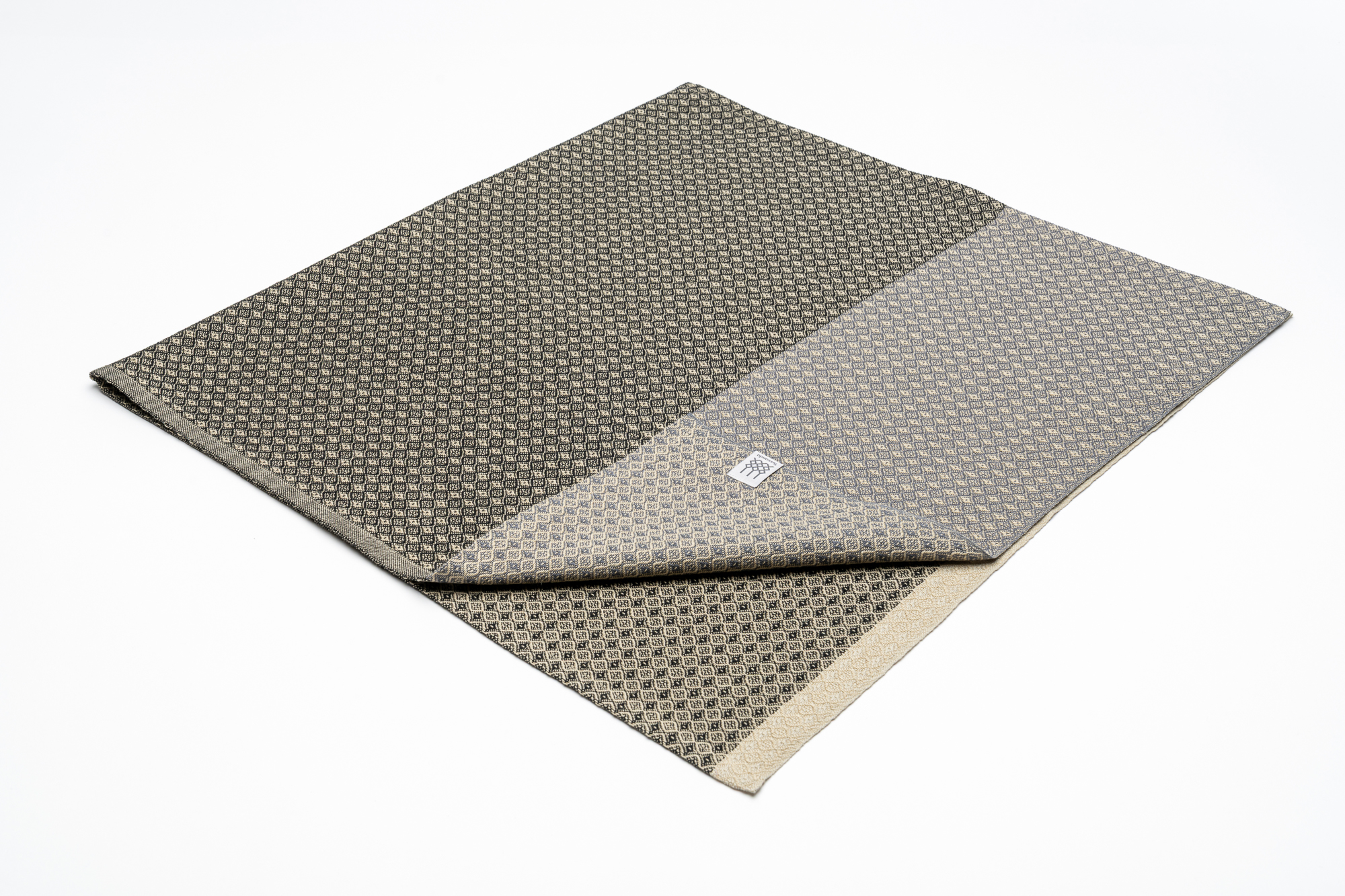 In der dunklen Variante von «Pachific» sind die Kettfäden dreifarbig in Schwarz, Grau und Beige aufgezogen, die unregelmässig breite Längsstreifen bewirken. Der Schussfaden ist einfarbig, entweder in Anthrazit, Beige oder Taubenblau. Es entsteht ein vier-farbiges Gewebe in drei unterschiedlichen Farbvarianten, die sich farblich bestens kombinieren lassen. Zu den kleinen Hamam-Handtüchern gibt es als Ergänzung die passenden, grossen Hamam-Tücher im Format 180 x 100 cm.