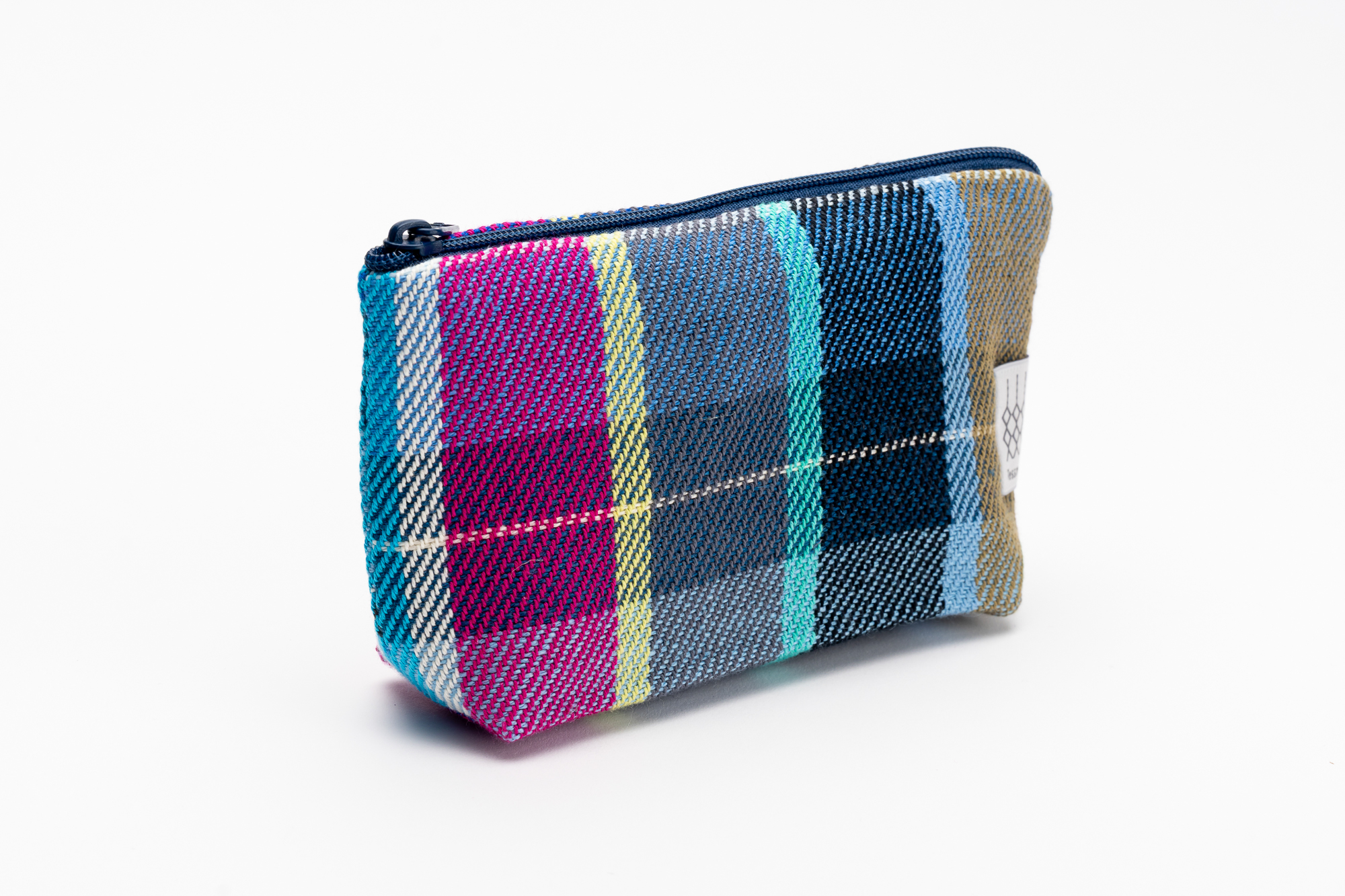 Der Stoff ist aus festem Halbleinen, so dass die Form stabil bleibt und den Inhalt gut schützt. Das Webmuster ist eine Köperbindung, gut ersichtlich an den diagonalem Webstreifen. In der Kette werden zahlreiche Farben aufgezogen, das Schussgarn wird alle paar Zentimeter gewechselt, so dass ein unregelmässiges, fröhlich-farbenreiches Karomuster entsteht.